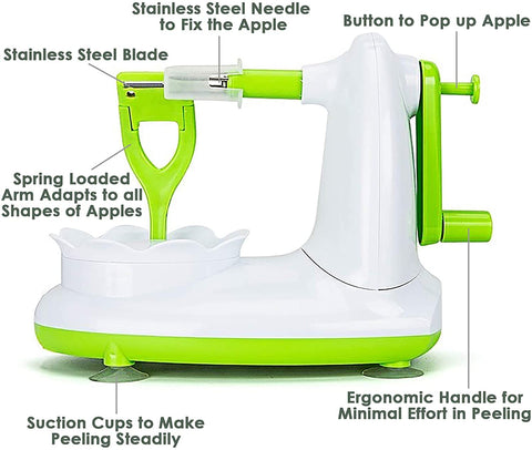 Quickly and easily peel, core and slice any apple variety. Blade cuts a wider peel than the more usual sort of metal peelers making it faster.