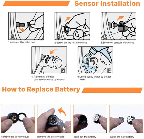 šćEASY TO INSTALLATION - SELF-INSTALL IN 10 MINUTESć1. Unscrew the valve dustproof cap then screw on the hexagonal nut; 2. Screw on the sensor; 3. Reversely tighen up the hexagonal nut to the sensor with the spanner; 4. Check the air leak using soapy water.