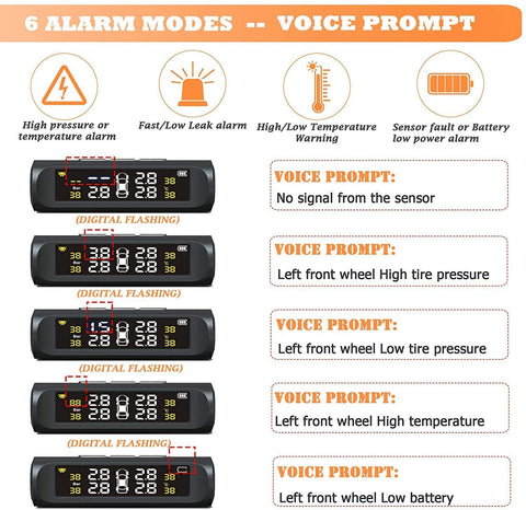 šćALARM PROMPT - BOOST DRIVING SAFETYćRocboc tire pressure monitoring system has accurate data, real-time display. To protect the safety of the driver and passengers, Including fast leak alarm, slow leak alarm, high-pressure alarm, high-temperature alarm, sensor fault alarm, and sensor battery low power alarm, to ensure your safe driving.